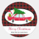 Os autocolantes de Natal com um legal e velho carregando de carro vermelho, um pinheiro de natal verde no seu telhado e um presente guardado no tronco aberto. Tem um belo estilo retro-anos 50. Fundo da xadrez de búfalo vermelha.