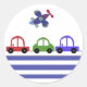 Um design divertido para as crianças. Três carros em vermelho, verde e azul. Um avião colorido acima. Uma borda de listras azuis e brancas.