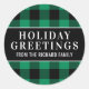 O design do adesivo de feriado quadrado apresenta uma mensagem de Cartões de natal personalizada que pode ser personalizada com o seu sobrenome ou nome de família. O texto é emoldurado por um fundo clássico verde e preto de verificação de xadrez de búfalos com padrão.