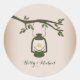 Um adesivo de casamento ao ar livre com um tema de natureza selvagem/acampamento apresentando uma ilustração de uma lanterna de acampamento verde pendurada em um galho de árvore com folhas verdes. Personalize o texto com seus nomes.