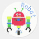 adesivo favorito de festa de aniversário com gráficos coloridos de um robô vermelho, verde, amarelo e azul. O texto azul pontilhado lê Robô e pode ser personalizado. Estão disponíveis suprimentos de partes correspondentes.