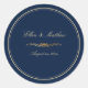 Um Marinho Elegante Blue e Dourado Vinheta de Casamento de Trim, desenhada com texto e guarnições dourados, sobre fundo azul Marinho, com decoração dourada. Este adesivo redondo clássico inclui o texto: Nomes e data de casamento da noiva e do noivo. Para personalizar, basta inserir seus detalhes em nosso modelo fácil, substituindo o texto de exemplo. Certifique-se de ver a Coleção de Casamento Azul e Dourado do Elegante para acessórios correspondentes.