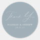 Etiquetas de casamento elegantes que exibem "Obrigado" em um belo roteiro de caligrafia branca com um fundo azul empoeirado ou cor de sua escolha. Personalize o obrigado moderno que você diz com seus nomes e data de casamento. O obrigado de casamento azul empoeirado que você cola é perfeito para usar para selar envelopes de cartões de agradecimentos, bolsas de casamento, etc.