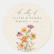 Um simples mas elegante adesivo redondo clássico de casamento desenhado com coloração d'água pintada à mão em buquê de flor silvestre e um fundo de linho dando uma dramática aparência de safra. Perfeito para casamento ao ar livre ou jardim.