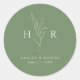 O adesivo redondo clássico monograma minimo, simples verde, de casamento botânico apresenta as suas iniciais em torno de uma botânica de desenho de linha, juntamente com um esquema de tipo clássico moderno.