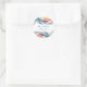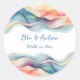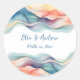 Um adesivo de Casamento moderno desenhado numa onda de cor abstrato brilhante, com texto azul profundo, sobre fundo branco. O texto inclui: Nomes e data de casamento da noiva e do noivo. Para personalizar, basta inserir seus detalhes em nosso modelo fácil, substituindo o texto de exemplo. Certifique-se de ver toda a Coleção de Casamentos de Ondas de Cores Modernas de Abstrato para cartões e acessórios correspondentes.