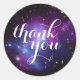 Belo obrigado de casamento celestial moderno que vocês colam. O fundo é uma bela imagem cósmica de aglomerado de galáxias roxas. O texto é totalmente personalizável. Por exemplo, você pode adicionar letras maiúsculas ou mover as palavras.