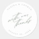 Elegante texto manuscrito com nossos obrigados em um adesivo de favor simples mas impressionante mostrado aqui que também mostra seus nomes e data de casamento em verde-sábio em branco. Procure ID954 para ver outros produtos e opções de cores para esta suíte de casamento.