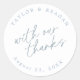 Elegante texto manuscrito com nossos obrigados em um adesivo de favor simples mas impressionante mostrado aqui que também mostra seus nomes e data de casamento em azul empoeirado em branco. Procure ID1045 para ver a coleção de casamento completa.