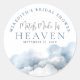 Adesivo de Chá de Panela "Match Made In Heaven". Um adesivo redondo encantador e elegante projetado para adicionar um toque sofisticado à sua celebração. Curvado em torno da borda, o texto "Chá de Panela da Nome" é exibido em fontes serifadas clássicas azuis, criando uma moldura atemporal para o design.