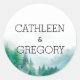 Um adesivo romântico de casamento com aquarelas que apresenta uma paisagem serena de montanha encapuzada em florestas verdes e peludas. As suaves matizes de esmeralda e azul-céu evocam um sentido de calma e elegância natural. Esta cena sonhadora e inspirada na natureza captura o espírito do amor e aventura eternos, perfeito para casais que encontram beleza no exterior e buscam um toque de sofisticação em seu dia especial.