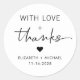 Obrigado moderno você cola para os favores da recepção de casamento e cartas de agradecimento com "Com amor + Obrigados" em uma simples tipografia e um roteiro na moda, e seus nomes e data de casamento.