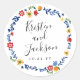 Design de casamento floral com estilo de arte popular, apresentando tipografia contemporânea com detalhes de caligrafia suave cercados por flores vermelhas, amarelas e cor-de-rosa.