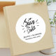 O casamento da Elegante Caligrafia da Na moda Salve a data do adesivo clássico redondo epitomiza sofisticação refinada e encanto moderno. Seu belo roteiro caligrafia dá um ar de elegância a qualquer anúncio de casamento ou convite. Este adesivo é especial porque combina perfeitamente a estética do eterno com a design contemporânea, fazer que seja uma escolha perfeita para casais que procuram anunciar sua data de casamento com estilo e graça. Ela simboliza o início de uma jornada juntos, marcada pela elegância e pelo talento pessoal, garantindo um começo memorável às suas festividades de casamento.