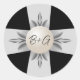 Adicione um toque pessoal aos seus envelopes de casamento e favores com estes bonitos autocolantes personalizados. Este adesivo apresenta uma pérola espantosa e uma design de fita branca num fundo preto dramático. Embora este adesivo fosse um toque maravilhoso para qualquer estação, as cores ousadas e contrastantes preto e branco seriam perfeitamente adequadas a um casamento formal de gravata negra. Os monogramas da noiva e do noivo são apresentados elegantemente no centro da pérola.