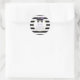 Crânios modernos e listras brancas pretas Casamento de Halloween roxo Salve o adesivo de Data. Ele exibe um padrão listrado preto e branco, um círculo branco no centro com seu texto e um casal de crânio divertido em roxo e preto na noiva com um arco, o noivo com um chapéu.