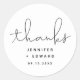 Um adesivo moderno de favorecimento de casamento com um roteiro escrito à mão que diz "obrigados" em preto e branco. Personalize este produto adicionando os nomes dos casais e a data do evento.