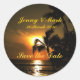 Personalize-os, salve a data das selas de envelope de casamento que mostram o pôr do sol ao longo da costa enquanto o sol mergulha atrás das palmeiras.