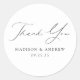 Etiquetas de casamento elegantes que exibem "Obrigado" em um belo roteiro de caligrafia preto com um fundo branco ou cor de sua escolha. Personalize o obrigado moderno que você diz com seus nomes e data de casamento. O obrigado de casamento de guião preta que você cola é perfeito para usar para selar envelopes de cartões de agradecimentos, bolsas de casamento, etc.