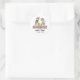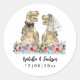 Noiva de dinossauro e noiva em um belo prado de flor silvestre, um adesivo de casamento do tema dinossauro para encantar seus convidados. Fácil de personalizar com os nomes da noiva e do noivo e a data do casamento no moderno roteiro de tipografia. Engraçado Tyrannosaurus Rex noiva e noiva e cor d'água ilustrações florais de verão em tons roxos, cor-de-rosa, verde e laranja. Dino original único e trabalho de arte floral de verão da artista Catherine Sweetman