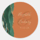 Este elegante e moderno adesivo de casamento apresenta uma esmeralda cor d'água verde agate design com falso brilho dourado. Personalize facilmente o texto dourado em um fundo laranja ou crosta queimado, com os nomes da noiva e noiva em caligrafia manuscrita sobre um grande e-mail.