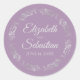 Esses adesivos elegantes para o casamento apresentam texto de cinza pálida rico em um fundo roxo claro ou de cor lavanda com uma borda floral de folha fina prateada. O texto é totalmente personalizável e contém os nomes dos casais de casamento e a data do casamento. Excelente como etiquetas de favor ou selos de envelope!