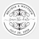 Uma rodada personalizada salve a etiqueta adesiva de data embelezada com um emblema decorativo de trabalho de rolagem. Insira seus nomes e data no lugar do texto de exemplo mostrado na modelo de design. Projetado para você pelo Blackberry Boulevard.