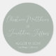 Este moderno e elegante evento ou adesivo de casamento apresenta um simples fundo verde de eucalipto com texto branco. Os nomes do casal são impressos em uma fonte de script. A data e o local do casamento são impressos abaixo.