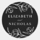 Elegante adesivos florais para casamentos com flores brancas esboçadas e folhas com fundo preto. Personalize os adesivos florais de casamento com seus nomes. Os adesivos florais são perfeitos para selar envelopes de casamento, favores de casamento e muito mais! Projetado para coordenar com a nossa coleção de casamento Floral.