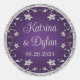 Este selo circular roxo e floral de casamentos de cinzas tem uma simulação de borda prateada em volta de todo o adesivo com flores prateadas e vinhas enrolando ao redor do adesivo redondo com um fundo roxo com os nomes da noiva e do noivo e a data do casamento em cinzas leves. Se você precisar de outros itens correspondentes, envie seu pedido por e-mail para niteowlstudio@gmail.com ou use o recurso de bate-papo Zazzle para entrar em contato.