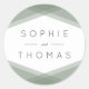 Este adesivo de casamento moderno apresenta uma design geométrica verde de sábio na frente com os nomes do casal de casamento. Personalize-o substituindo o texto do marcador de posição. Para obter mais opções, como alterar a fonte, seu tamanho e espaçamento entre letras, clique no botão "Personalizar". *Observe que a Marca d'água do Zazzle que aparece na visualização de zoom NÃO aparecerá no produto impresso final. © Rosewood e Citrus
