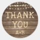 Adesivos de agradecimento de casamento com um fundo rústico de madeira castanha envelhecida e luzes de fada com brilho amarelo suave, juntamente com o título de AGRADECEMOS e suas iniciais em uma fonte impressa à mão country western. Use como selos de envelope ou para lembranças de casamento. Entre em contato com o designer via Zazzle Chat ou makeitaboutyoustore@gmail.com se desejar que este design seja modificado, em outro produto ou itens correspondentes.
