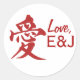 As etiquetas modernas deste "amor" consistem no caráter "amor" no chinês no brilho vermelho, e em iniciais customizáveis.