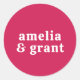 Os adesivos de casamento do estilo moderno, com um layout simples e mínimo com seus nomes em uma fonte retrógrada. O esquema de cores brilhantes é um vibrante Viva Magenta rosa. As fontes/cores podem ser alteradas na ferramenta de edição de design. Estes adesivos de casamento são excelentes como selos de envelopes ou para personalizar seus favores de casamento.