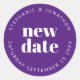 Conveniente para as suas mensagens sobre os seus planos de casamento alterados, este design de texto totalmente personalizável tem o New Date corajosamente no centro, e os seus nomes são curvos acima e a sua nova data de casamento é curvada em branco, contra um fundo roxo. Você também pode alterar as cores do texto e do plano de fundo se desejar, por meio da opção personalizar mais.