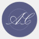 Clássica caligrafia formal com um monograma de escrita circular, simples selo elegante azul e branco de envelope marinho, ou vinheta de casamento da embalagem.