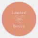 Com a simplicidade moderna e uma vibração ensolarada dos citros, esta design de casamento minimalista tem um estilo moderno clássico em letras brancas, num ousado fundo laranja cítrico com o elemento na moda caligrafia que soletra a palavra "e" no talento moderno. Personalize o modelo de texto com os nomes da noiva e do noivo para um versátil adesivo de casamento que tem tantos usos. Use-os como selos de envelopes nos seus convites para o casamento, ou como etiquetas de favorecimento ou etiquetas para favores de casamento. Perfeito para casamentos em primavera e verão, ou com tema mediterrânico dos citros.