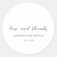 Os adesivos modernos de casamento com um simples design com fontes clássicas de serifa e de script elegante. A design inclui "amor e obrigados" e seus nomes e data de casamento.