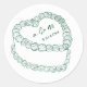 Vintage Cake Casado com Vintage. Estes adesivos de casamento redondos personalizados apresentam uma simples ilustração de bolo no estilo vintage no centro, revestidos com as iniciais do monograma do casal e a data de casamento para um toque eterno e elegante. O design minimalista usa uma mistura de fontes manuscritas e escritas em verde esmeralda, mantendo a aparência refinada, mas acessível. Totalmente personalizável, você pode ajustar o texto e o layout para corresponder ao seu tema de casamento. Perfeito para selar convites, decorar favores, ou adicionar um toque pessoal à papelaria do seu casamento, estes adesivos trazem charme e sofisticação para a sua celebração.