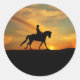 Você pode personalizar esses adesivos também! Um belo nascer do sol e um cavaleiro de vestimenta e cavalo são silenciados à luz.