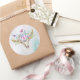 Um autocolante com turquesa e fundo de aquarela pastel. Um crânio bicho-papão com um buquê floral sobre sua cabeça e pequenas borboletas se espalhando.