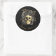 Crânio gótico com rosas pretas e douradas em torno de adesivo editável. O design apresenta crânio vintage decorado com rosas pretas e douradas brilhantes em um fundo preto! Use como selo assustador perfeito em seus convites de Halloween e convites com tema gótico! Ótimo para artesanato de Halloween, embrulho de presente, decoração de seu planejador e scrapbooking. Personalize o texto e altere o estilo e a cor da fonte para combinar. O brilho não é um efeito de "brilho real", mas sim um efeito impresso.