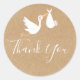 Obrigado adesivo redondo clássico, apresentando uma cegonha fofa carregando uma entrega muito especial, com um lindo obrigado em escrita branca, em um fundo kraft rústico, este adesivo de baby shower/chá de bebê é perfeito para um baby shower/chá de bebê especial. Projetado para combinar com nossa coleção de baby shower/chá de bebê Entrega Especial.