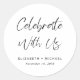 Um adesivo de chic para seus convites de casamento com "Celebrar conosco" em uma escrita moderna e seus nomes e data em uma tipografia serif simples e elegante.