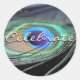 Uma fotografia festiva do olho roxo e turquesa de uma pena de pavão brilhante. A mensagem do selo do adesivo anota "Celebrar", mas as palavras podem ser personalizadas nos selos do rótulo. Torne a festa especial a favor de decalques de etiqueta de presente com seu próprio texto e imagens usando a opção "Personalizar o produto" para feriados personalizados e ocasiões especiais de vida feriados autodidatas e pautas de arte!
