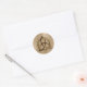 Um conjunto de adesivos redondos com um triquetra celta simples e colorido entrelaçados com um círculo formando um símbolo trinitário contra um fundo de madeira, representando a unidade espiritual com o divino.
