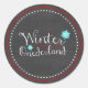 Etiquetas temáticos do partido de primeiro aniversario do inverno bonito. Flocos de neve azuis da cerceta das características de design e redemoinhos do vermelho em um fundo do quadro. Aperfeiçoe para chapéus de coco do cupcake ou etiquetas do saco do favor.