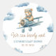 Essos adesivos de chá de bebê apresentam um ursinho Teddy menino voando um avião entre nuvens fofas com o texto "Mal podemos esperar" e os detalhes do seu chá.