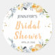 Um buquê floral boho elegante com sotaques de pêssego e azul com folhagens botânicas. Alegre e leve; perfeito para um chá de noiva na primavera ou verão. Personalize este adesivo de chá de noiva com seu nome e a data do seu evento.