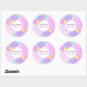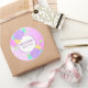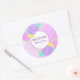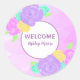 Adesivo de boas-vindas ao bebê com flores rosa, roxo e amarelo personalizável com fundo roxo. Perfeito para selos de envelope, selos de sacos de favores, para adicionar a pacotes e muito mais.
